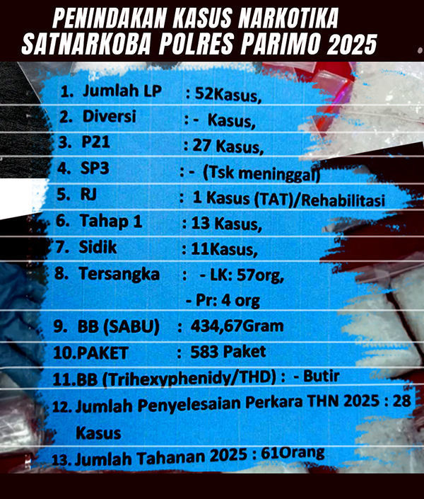 “Ini bukan sekadar angka, tetapi bukti nyata dari semangat kami dalam melindungi generasi muda Parimo dari bahaya narkotika. Setiap kasus terungkap adalah langkah menuju masa depan lebih bersih, sehat, dan bebas narkoba”, kata Iptu Anuegrah Sejahtera Tarigan .