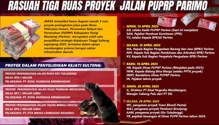 PADA 14 hingga 29 April 2025, Kejati Sulteng memanggil dan memintai keterangan hampir semua pihak terkait kelola 3 ruas proyek peningkatan jalan di Parimo.
