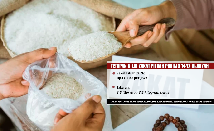 Penetapan besaran zakat tersebut tertuang dalam Surat Nomor B.167/Kk.22.9/BA.03/02/2026 tanggal 23 Februari 2026, ditujukan kepada Kepala KUA, Ketua Unit Pengumpul Zakat (UPZ) kecamatan dan desa, amil zakat masjid, serta penyuluh agama islam seluruh Parimo.